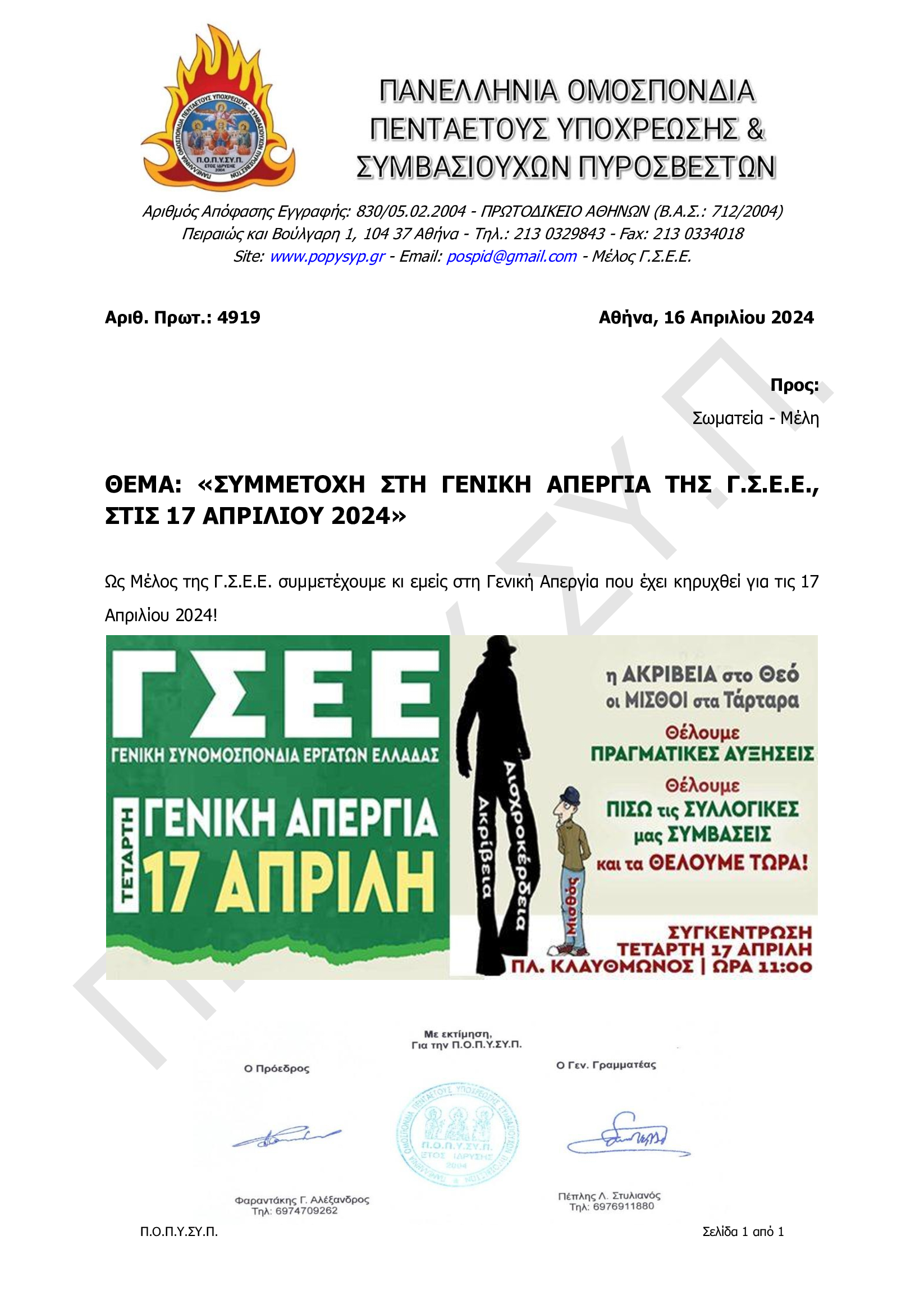 ΣΥΜΜΕΤΟΧΗ ΣΤΗ ΓΕΝΙΚΗ ΑΠΕΡΓΙΑ ΤΗΣ Γ.Σ.Ε.Ε., ΣΤΙΣ 17 ΑΠΡΙΛΙΟΥ 2024