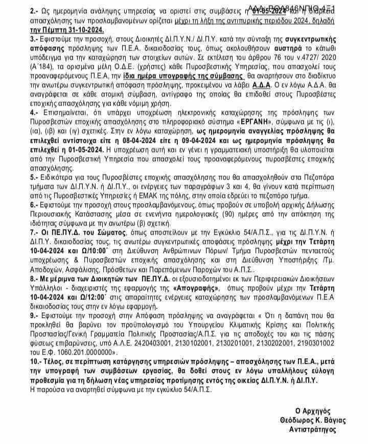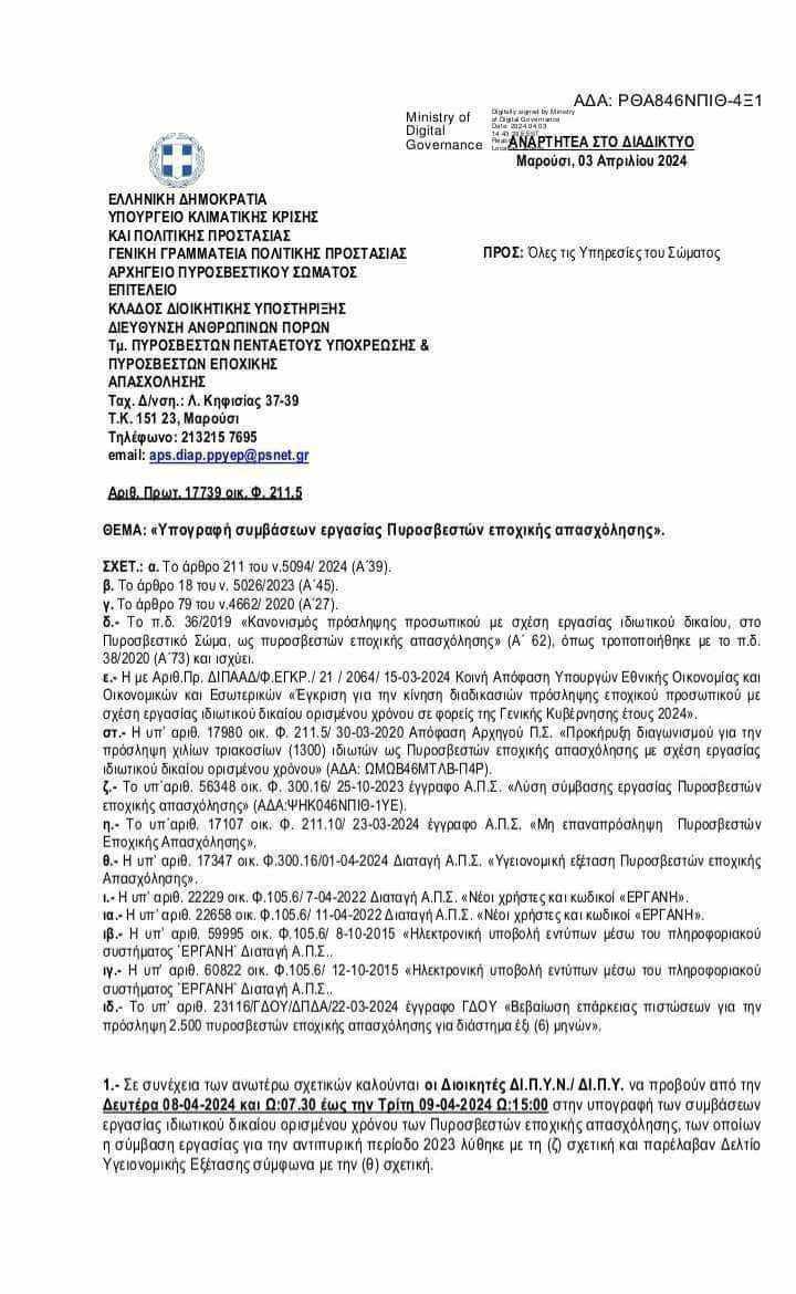 Υπογραφή συμβάσεων εργασίας Πυροσβεστών εποχικής απασχόλησης