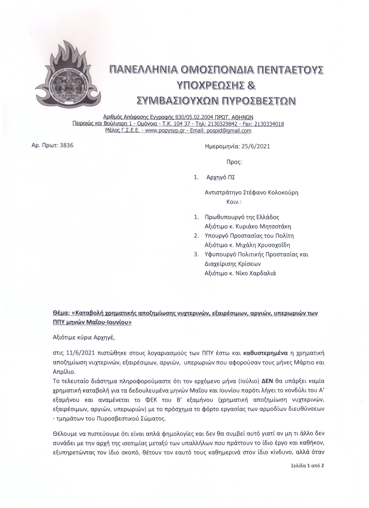 Επιστολή προς τον Αρχηγό του ΠΣ με θέμα "Καταβολή χρηματικής αποζημίωσης νυχτερινών, εξαιρέσιμων, αργιών, υπερωριών των ΠΠΥ μηνών Μαΐου-Ιουνίου"