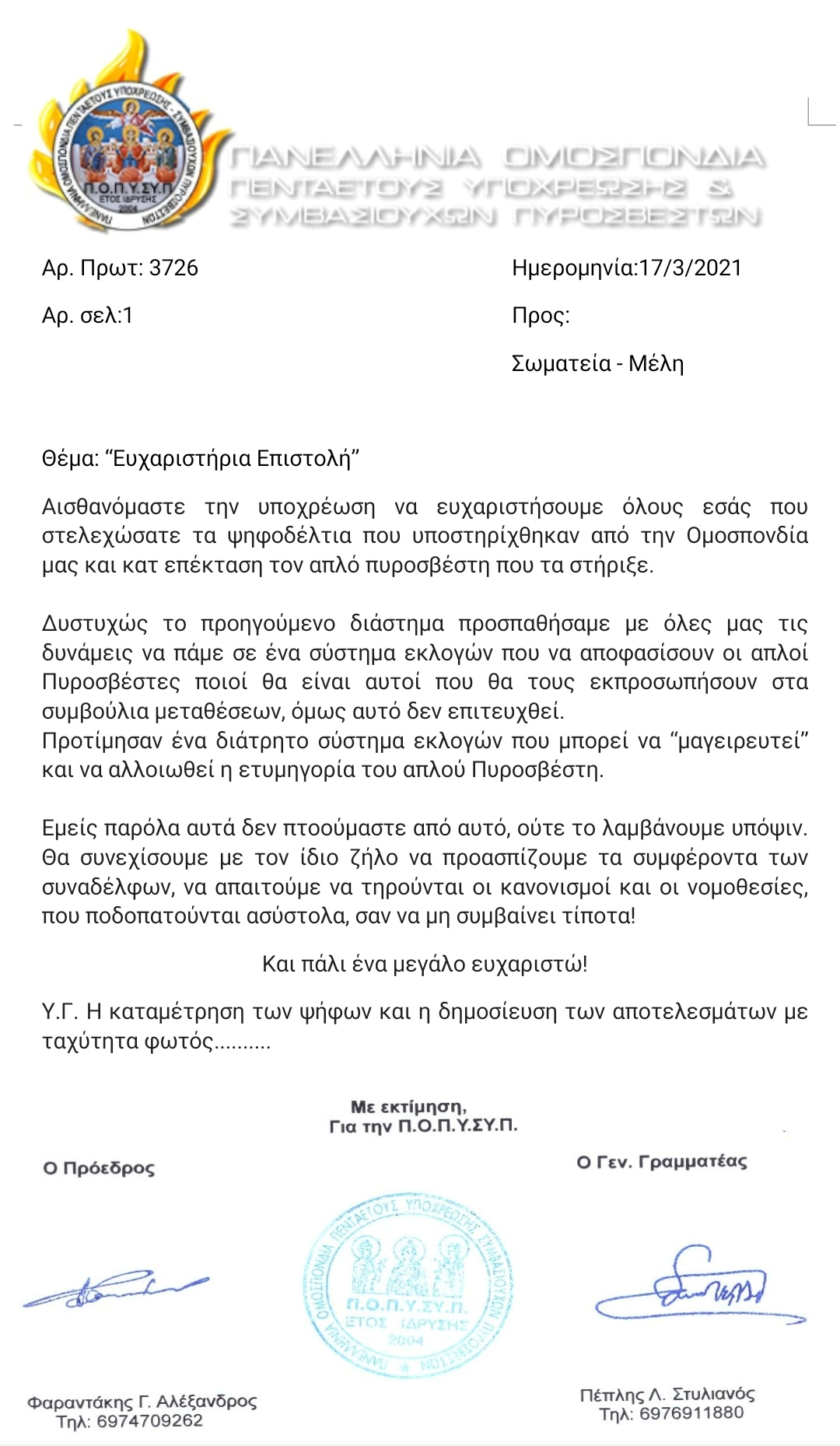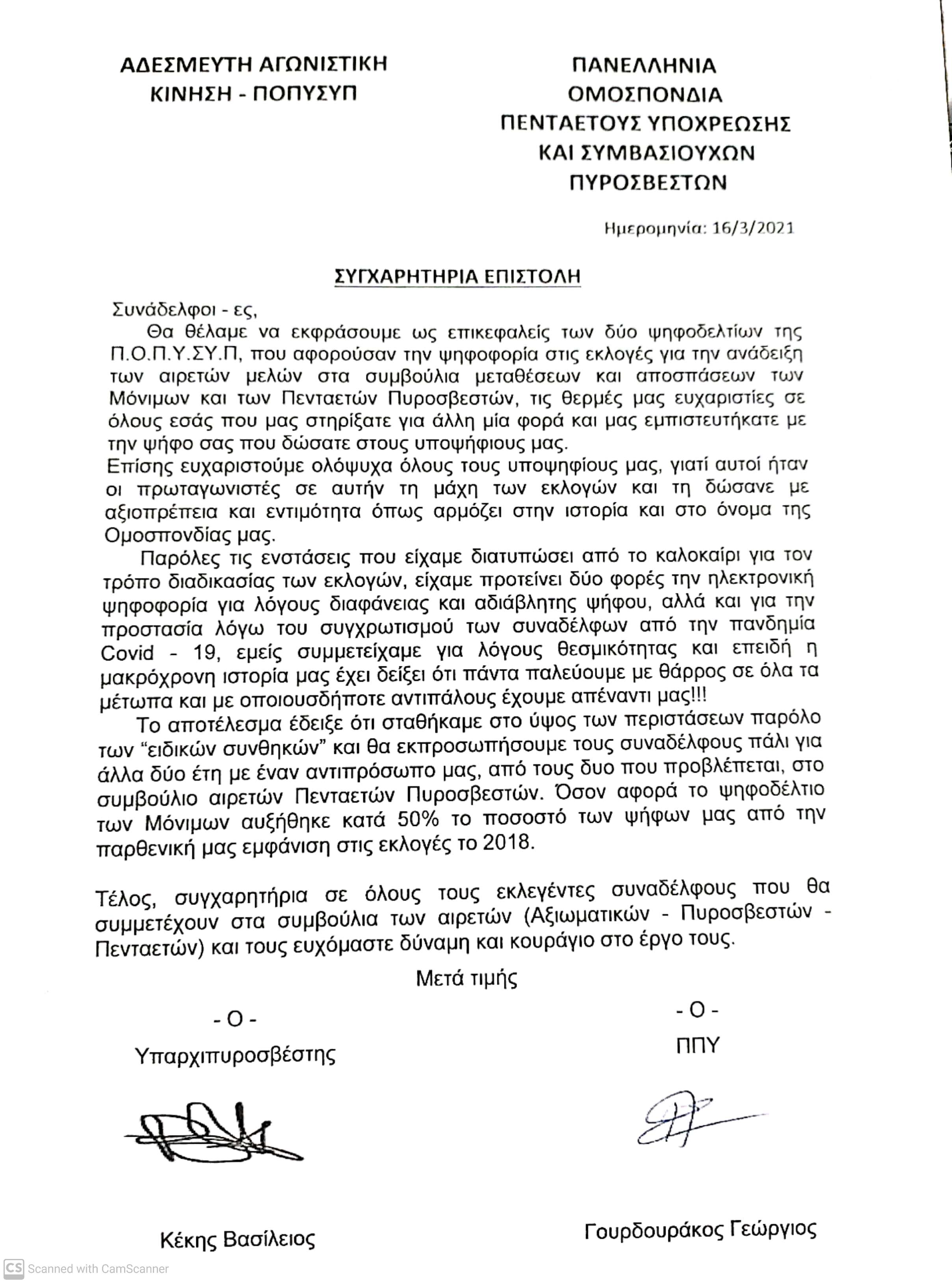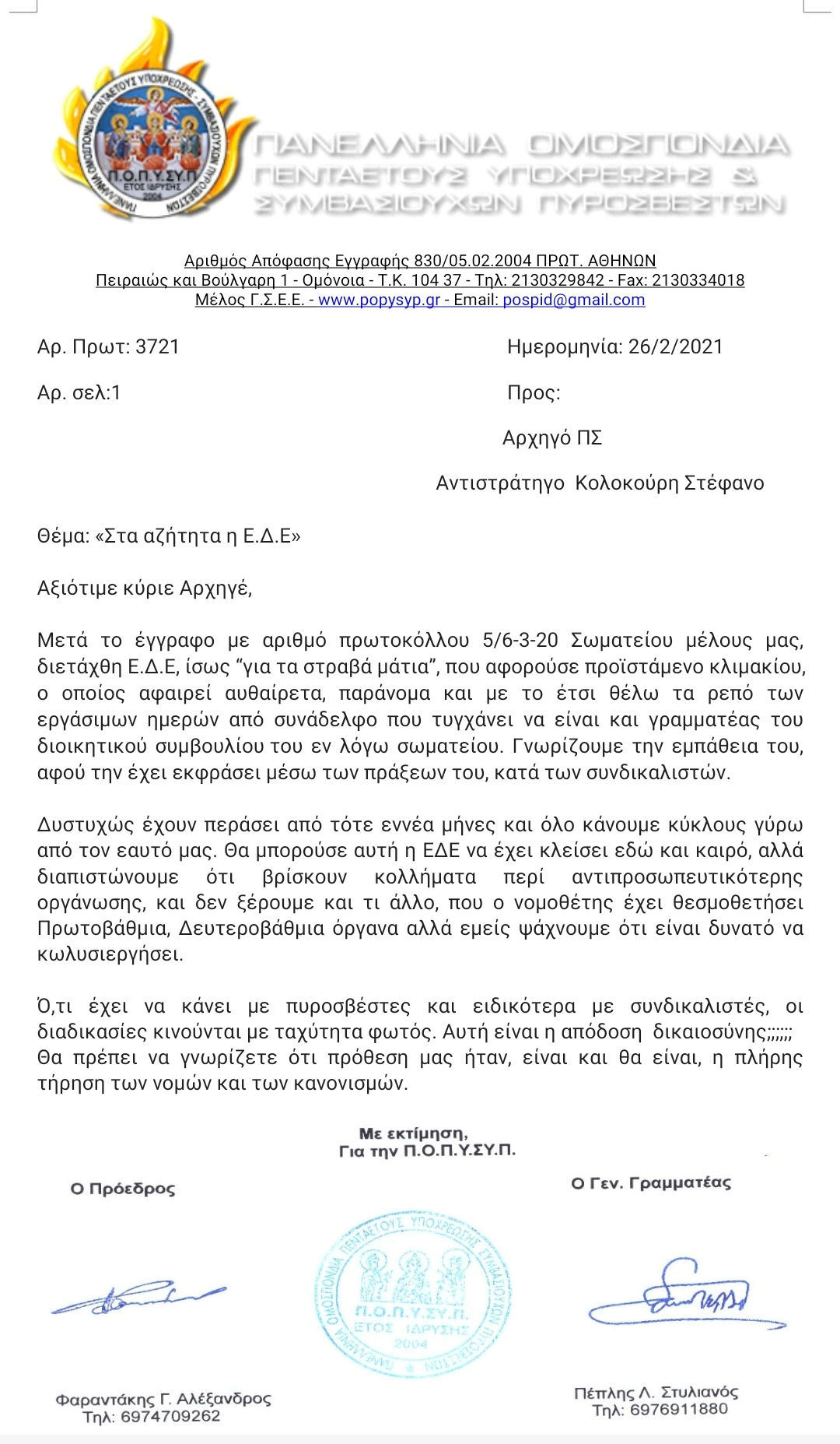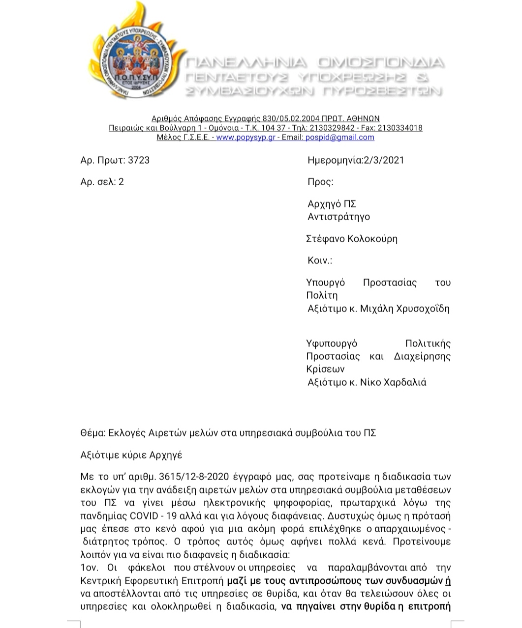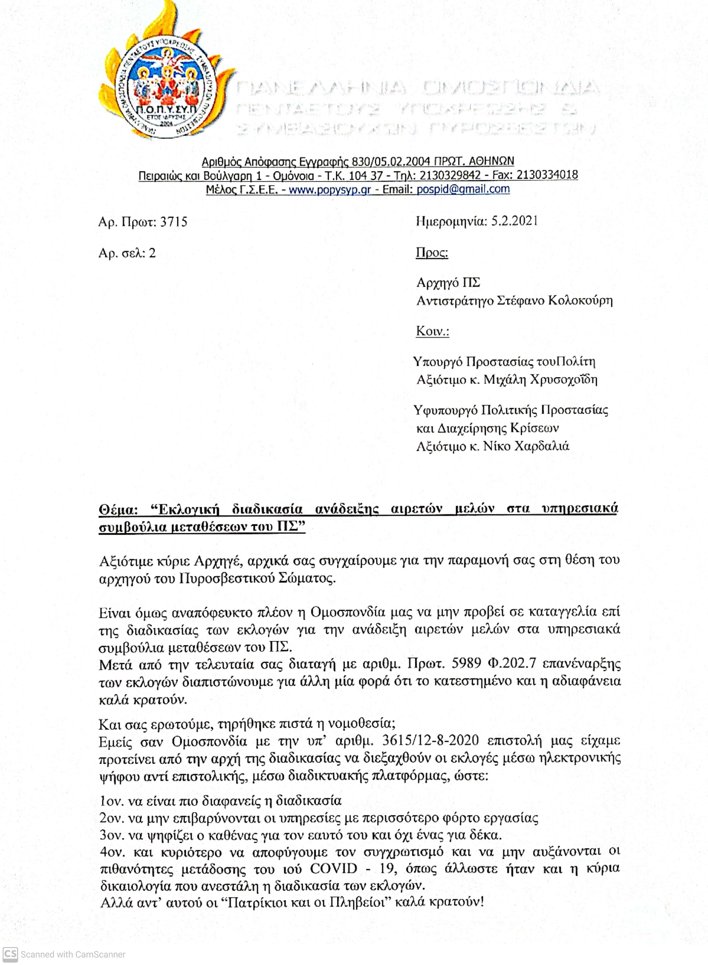 Επιστολή προς τον Αρχηγό με θέμα: "Εκλογές Αιρετών μελών στα υπηρεσιακά συμβούλια του ΠΣ"