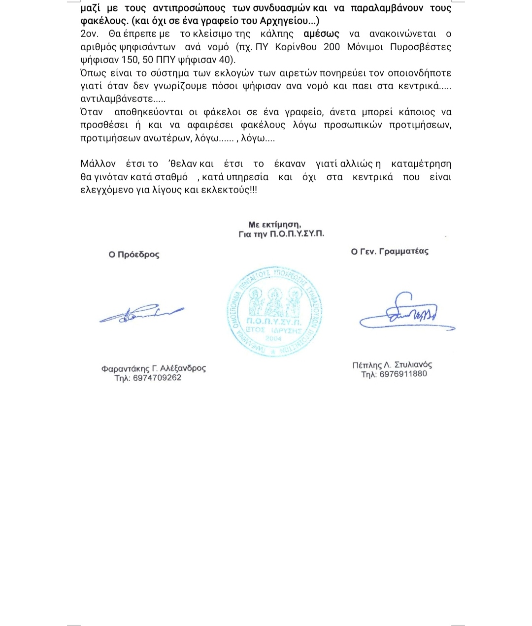 Καταγγελία προς τον Αρχηγό με θέμα "Εκλογική διαδικασία ανάδειξης αιρετών μελών στα υπηρεσιακά συμβούλια του ΠΣ"