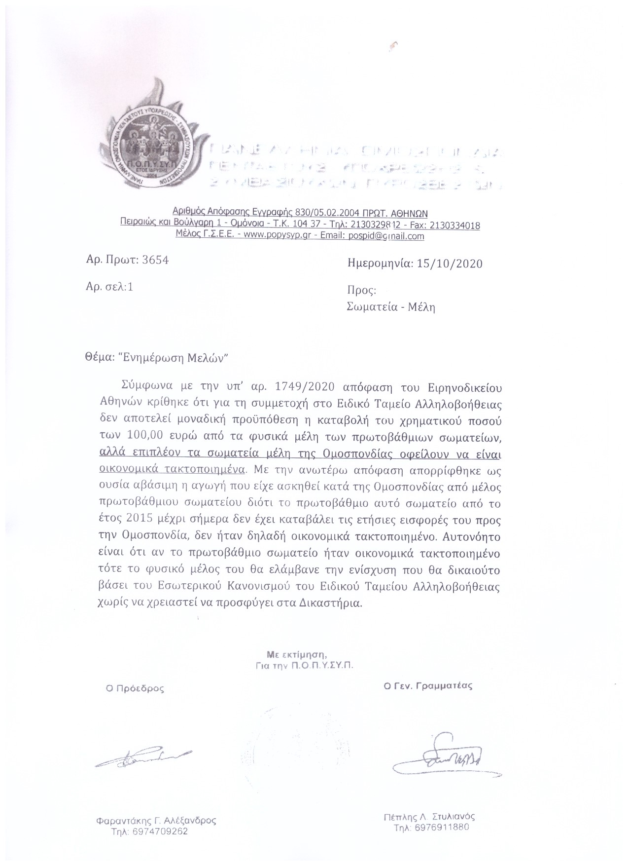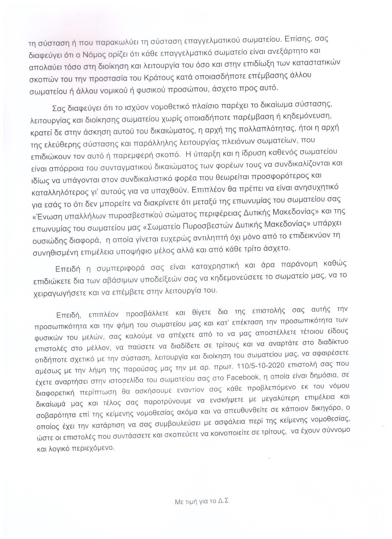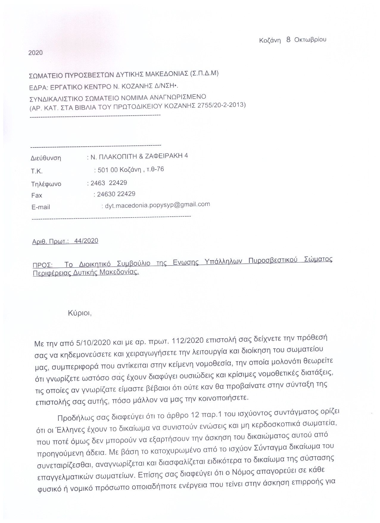 Επιστολή του Σωματείου Πυροσβεστών Δυτικής Μακεδονίας προς το ΔΣ της Ένωσης Υπαλλήλων Πυροσβεστικού Σώματος Περιφέρειας Δυτικής Μακεδονίας