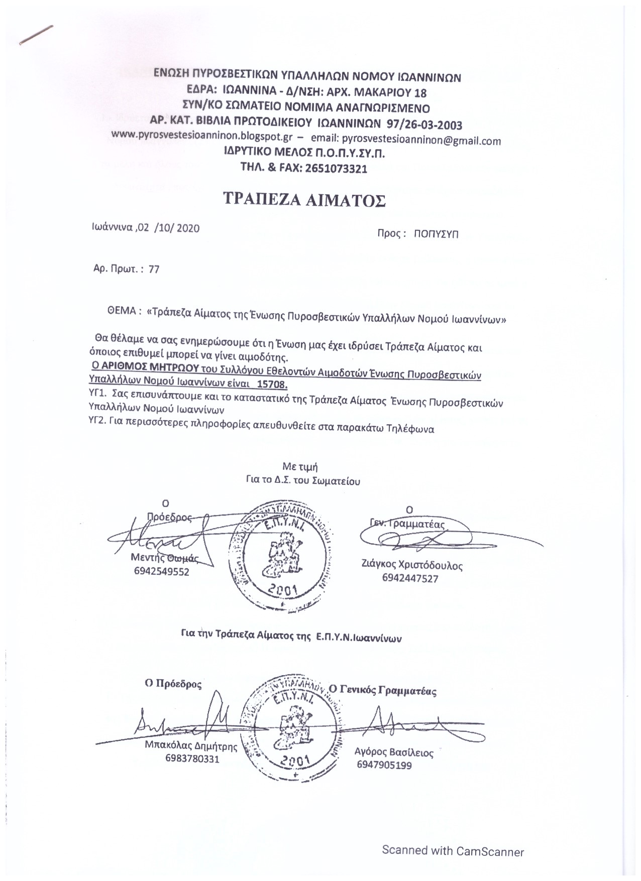 Τράπεζα Αίματος της Ένωσης Πυροσβεστικών Υπαλλήλων Νομού Ιωαννίνων