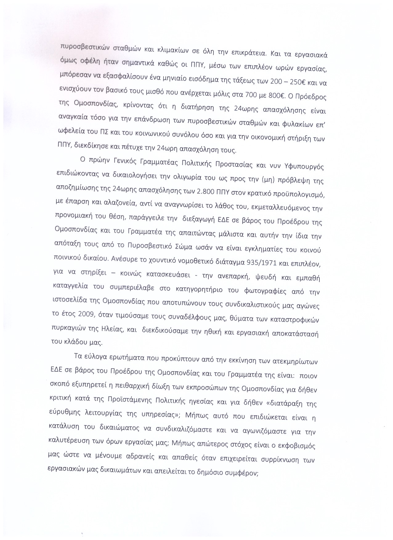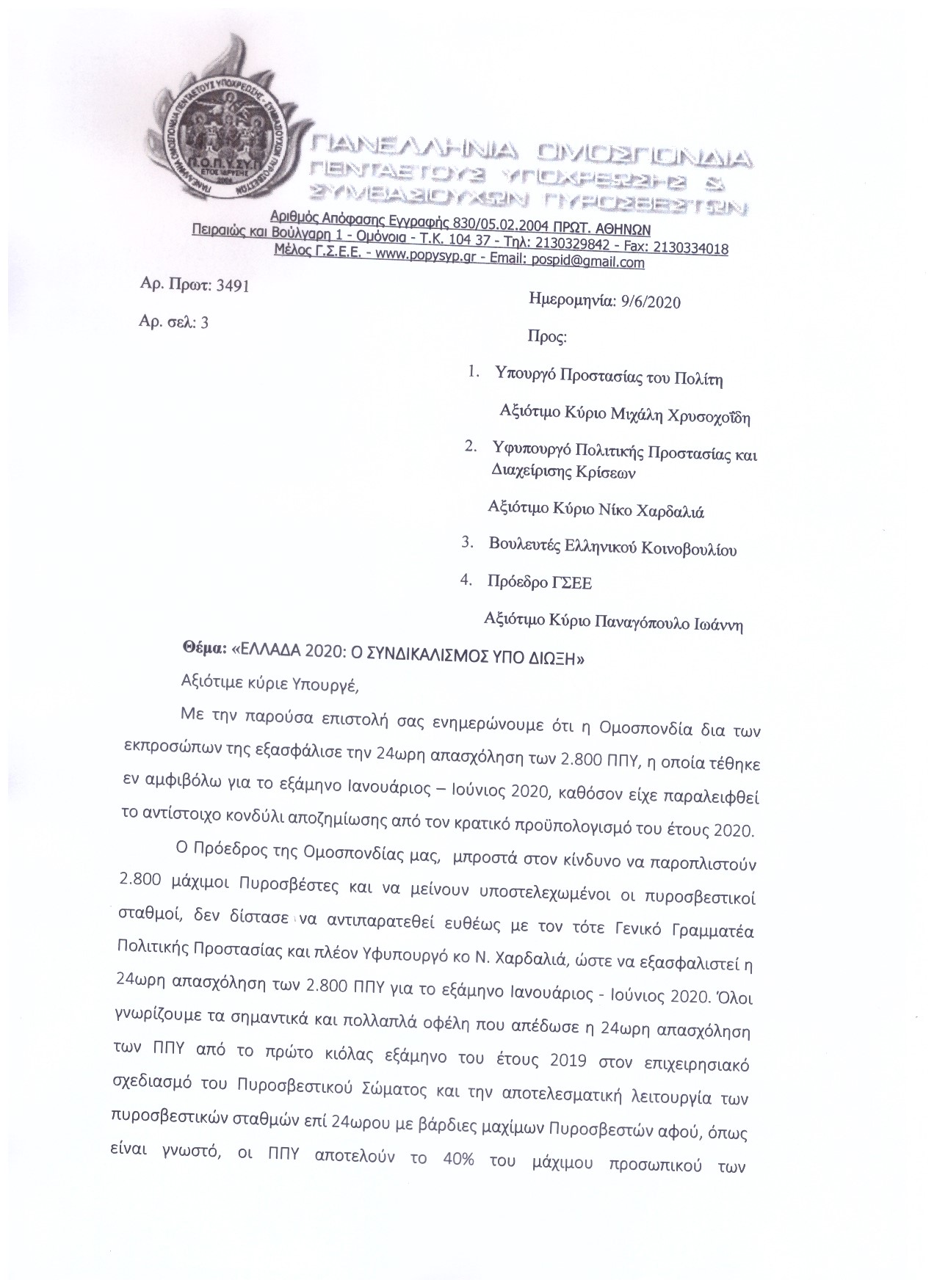 Επιστολή του Σωματείου Πυροσβεστών Δυτικής Μακεδονίας με θέμα: "Οργανική θέση υπαλλήλων που υπηρετούν στα πεζοπόρα" προς το Αρχηγείο ΠΣ