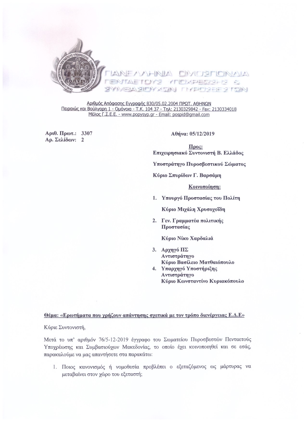 Ερωτήματα σχετικά με τον τρόπο διενέργειας Ε.Δ.Ε προς τον Επιχειρησιακό Συντονιστή Β.Ελλάδος Υποστράτηγο ΠΣ κ. Σπυρίδων Βαρσάμη
