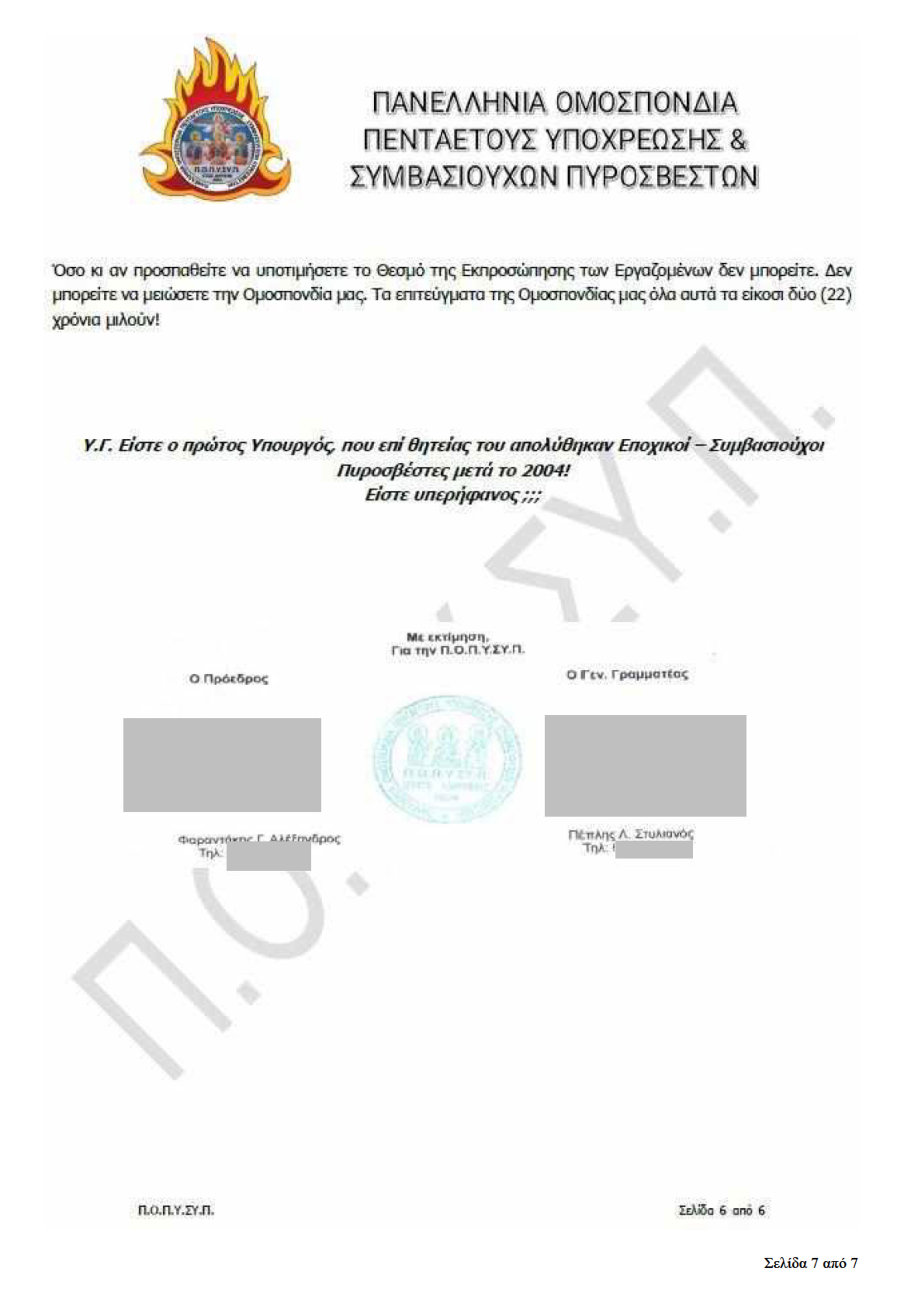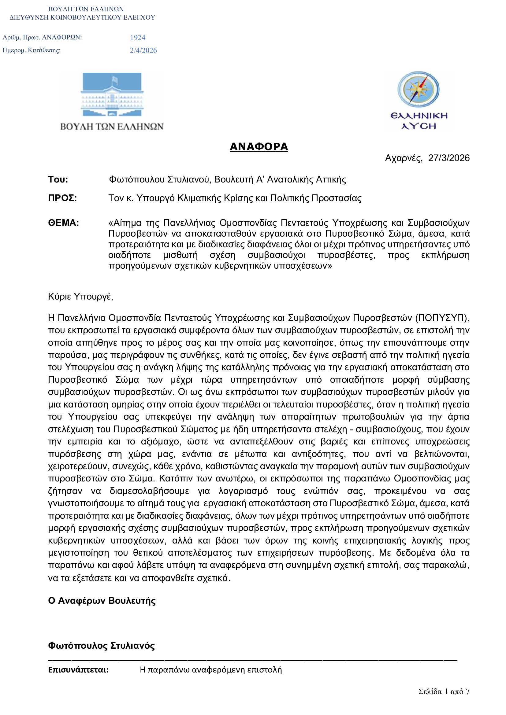 Παράλληλα, εκφράζει έντονη δυσαρέσκεια για τις αλλαγές στο καθεστώς των πυροσβεστών πενταετούς υποχρέωσης, κάνοντας λόγο για συνέχιση της εργασιακής ομηρίας.