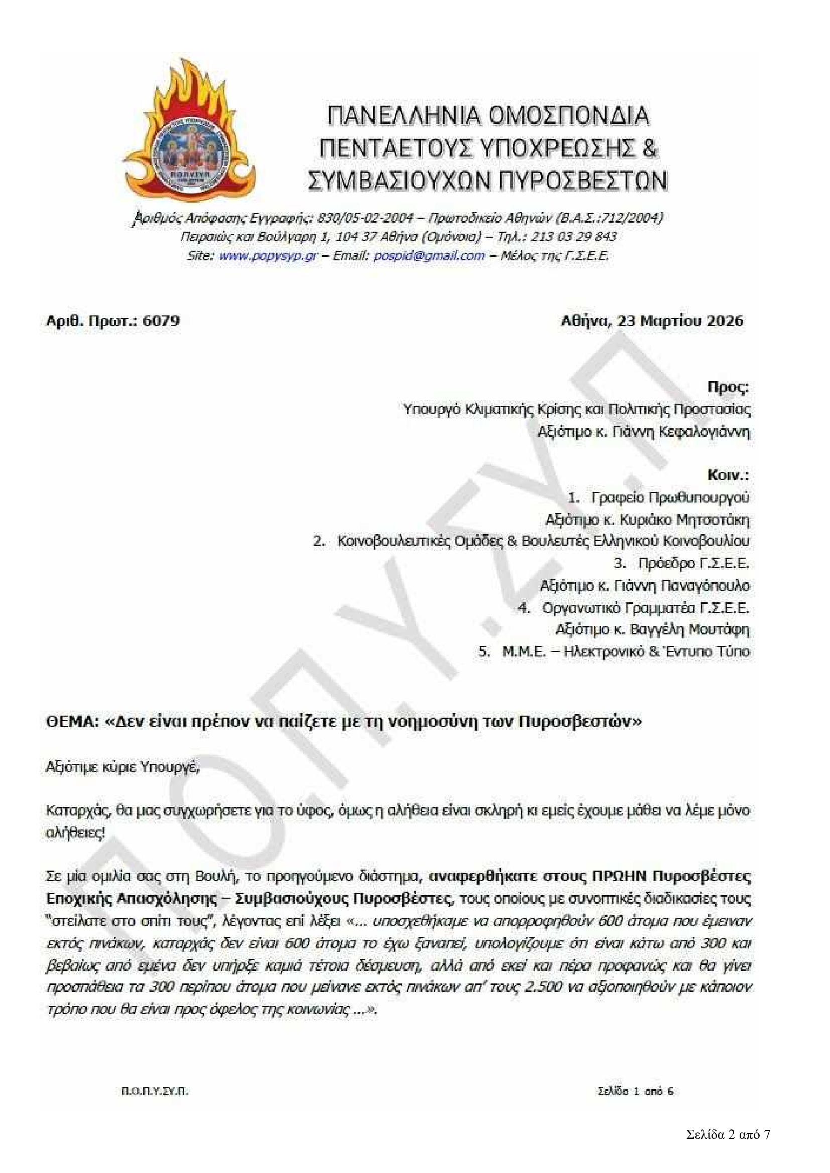Η Πανελλήνια Ομοσπονδία Πενταετούς Υποχρέωσης και Συμβασιούχων Πυροσβεστών εξαπολύει σφοδρή επίθεση κατά του Υπουργού Κλιματικής Κρίσης και Πολιτικής Προστασίας.