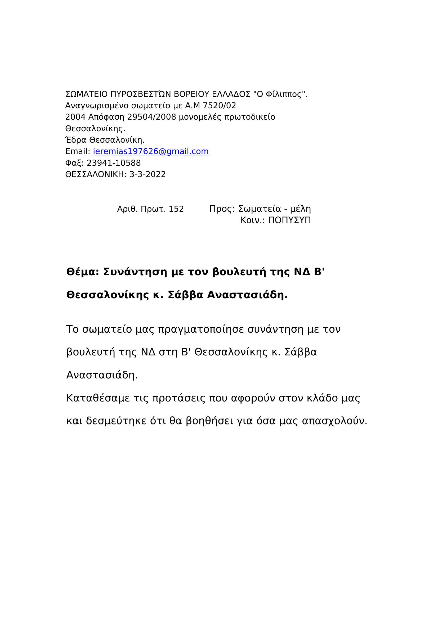 - Συνάντηση αντιπροσωπείας της Ομοσπονδίας μας με την κα Μαρία Αντωνίου, επικεφαλή του γραφείου του Πρωθυπουργού στη Θεσσαλονίκη
