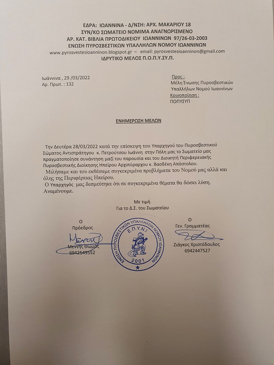 Να σημειωθεί ότι, κατά τη διάρκεια της επίσκεψής του, ο Υπαρχηγός είχε επαφές και με τους εκπρόσωπους των συνδικαλιστικών φορέων των πυροσβεστικών υπαλλήλων, ενώ αντάλλαξε απόψεις και ενημέρωσε τα στελέχη της σερραϊκής Υπηρεσίας για θέματα που αφορούν στο Σώμα και στο ανθρώπινο δυναμικό του.