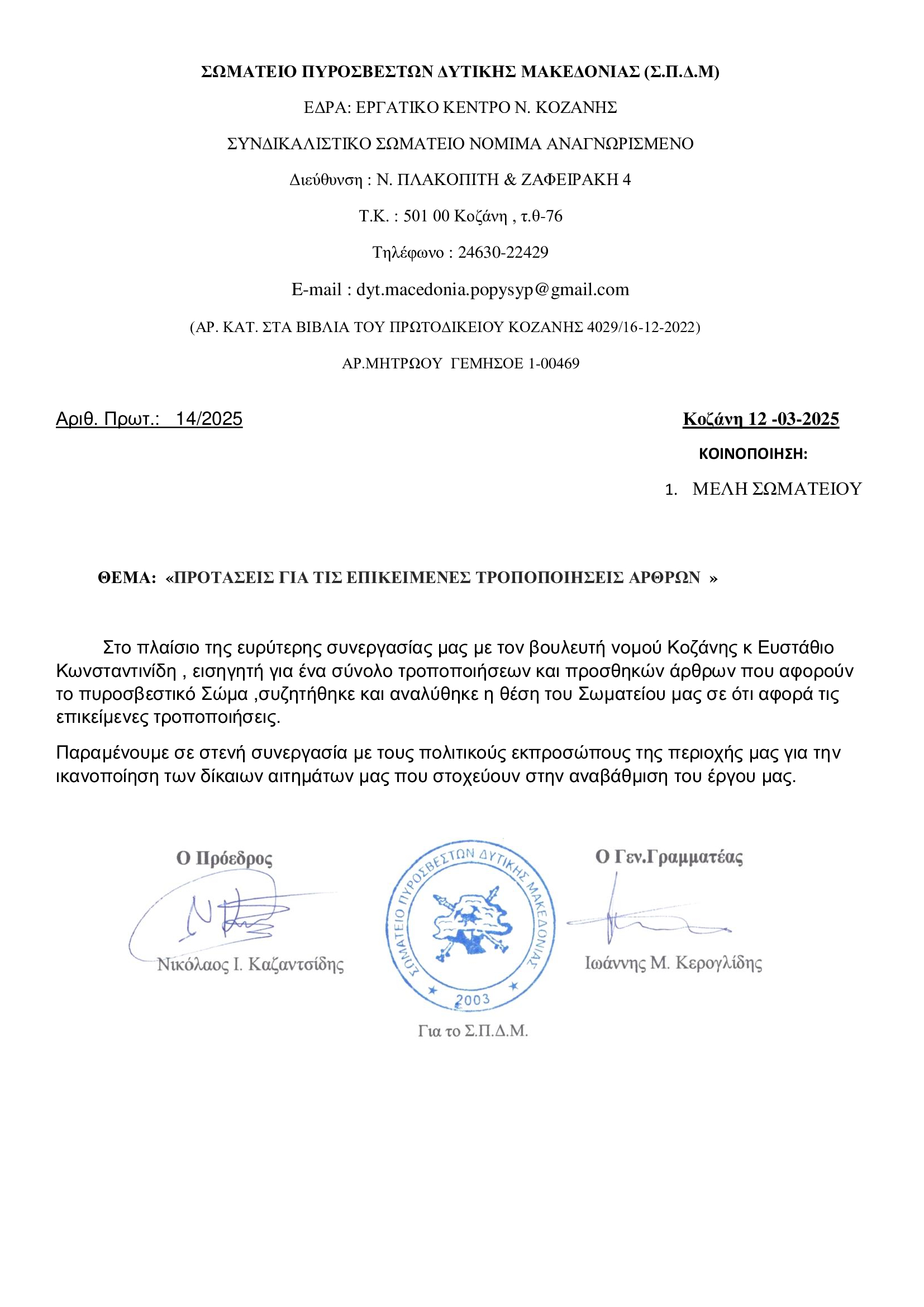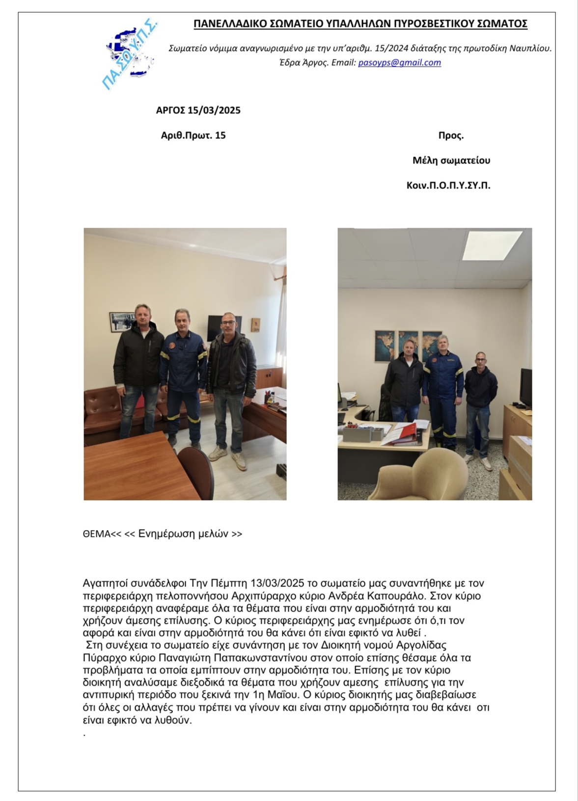 Ενημέρωση Μελών από το Πανελλαδικό Σωματείο Υπαλλήλων Πυροσβεστικού Σώματος με έδρα το Άργος