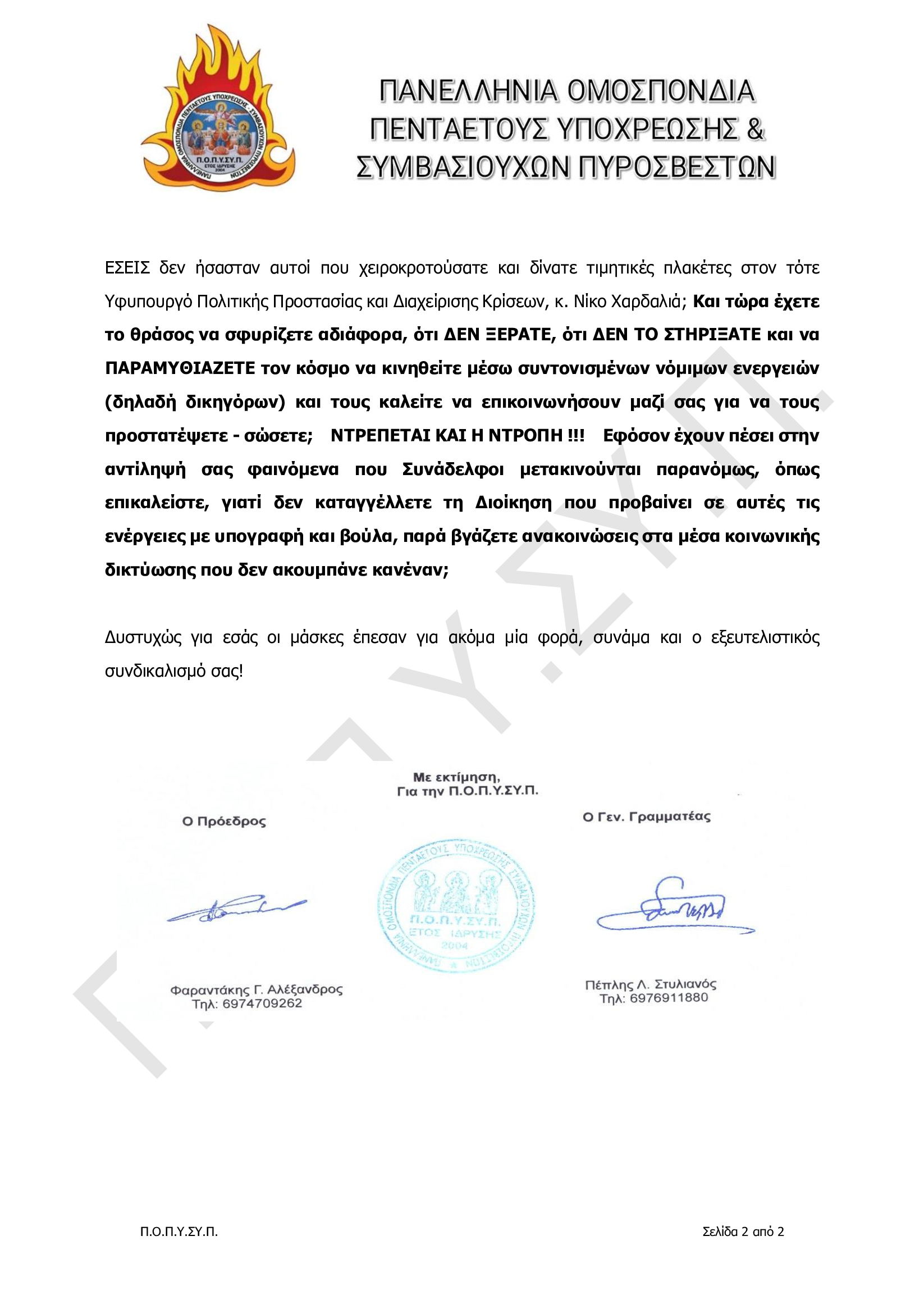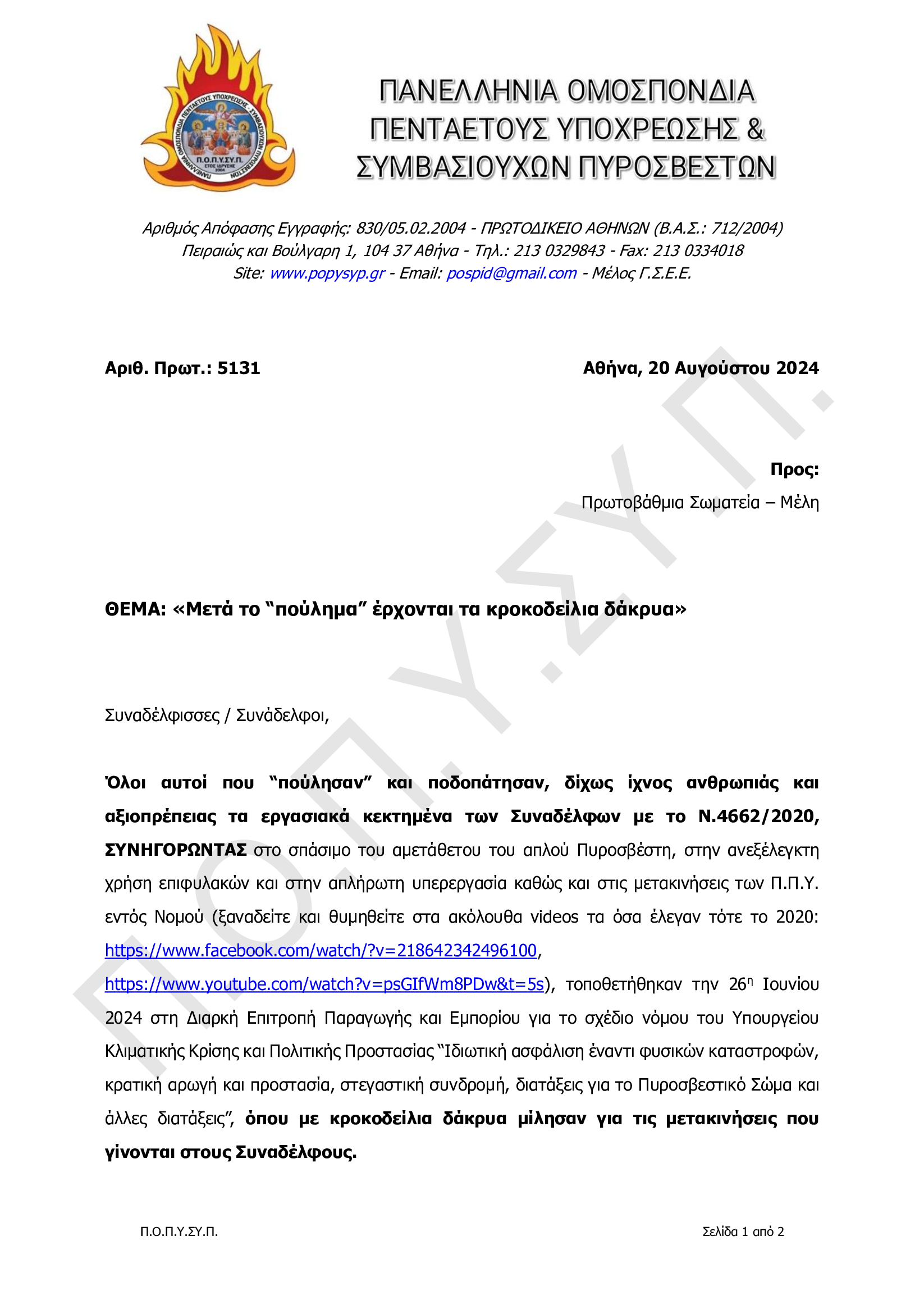 Δείτε ολόκληρη τη συνέντευξη του Προέδρου της Ένωσης Πυροσβεστικών Υπαλλήλων Νομού Ιωαννίνων και Μέλους του Δ.Σ. της Π.Ο.Π.Υ.ΣΥ.Π., κ. Θωμά Μεντή, που δόθηκε στις 19-08-2024 στο Κεντρικό Βραδινό Δελτίο Ειδήσεων του τηλεοπτικού σταθμού ΗΠΕΙΡΟΣ TV1, στο YouTube: https://youtu.be/2qYpYbonJ2Y?si=kErxli3anIc8vezy