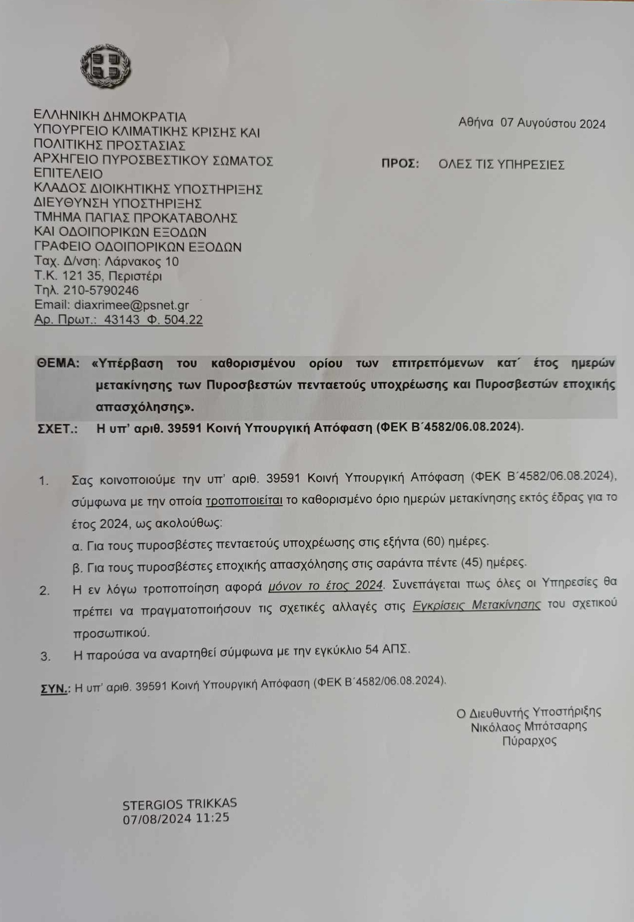Υπέρβαση του καθορισμένου ορίου των επιτρεπόμενων κατ' έτος ημερών μετακίνησης των Π.Π.Υ. και Πυροσβεστών Εποχικής Απασχόλησης