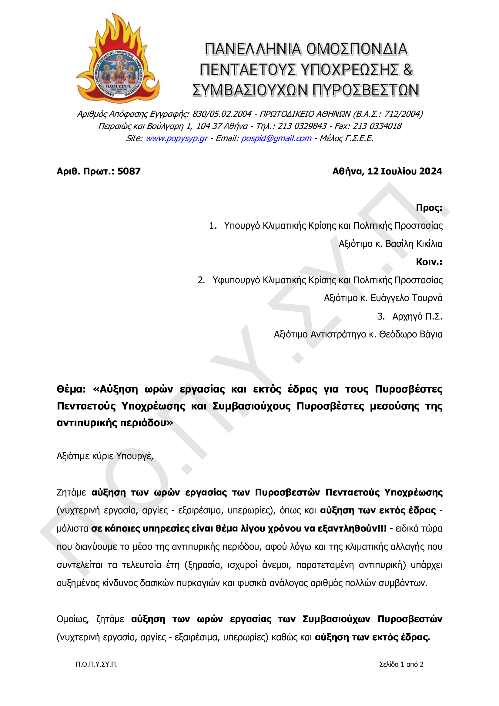 Αύξηση ωρών εργασίας και εκτός έδρας για τους Πυροσβέστες Πενταετούς Υποχρέωσης και Συμβασιούχους Πυροσβέστες μεσούσης της αντιπυρικής περιόδου