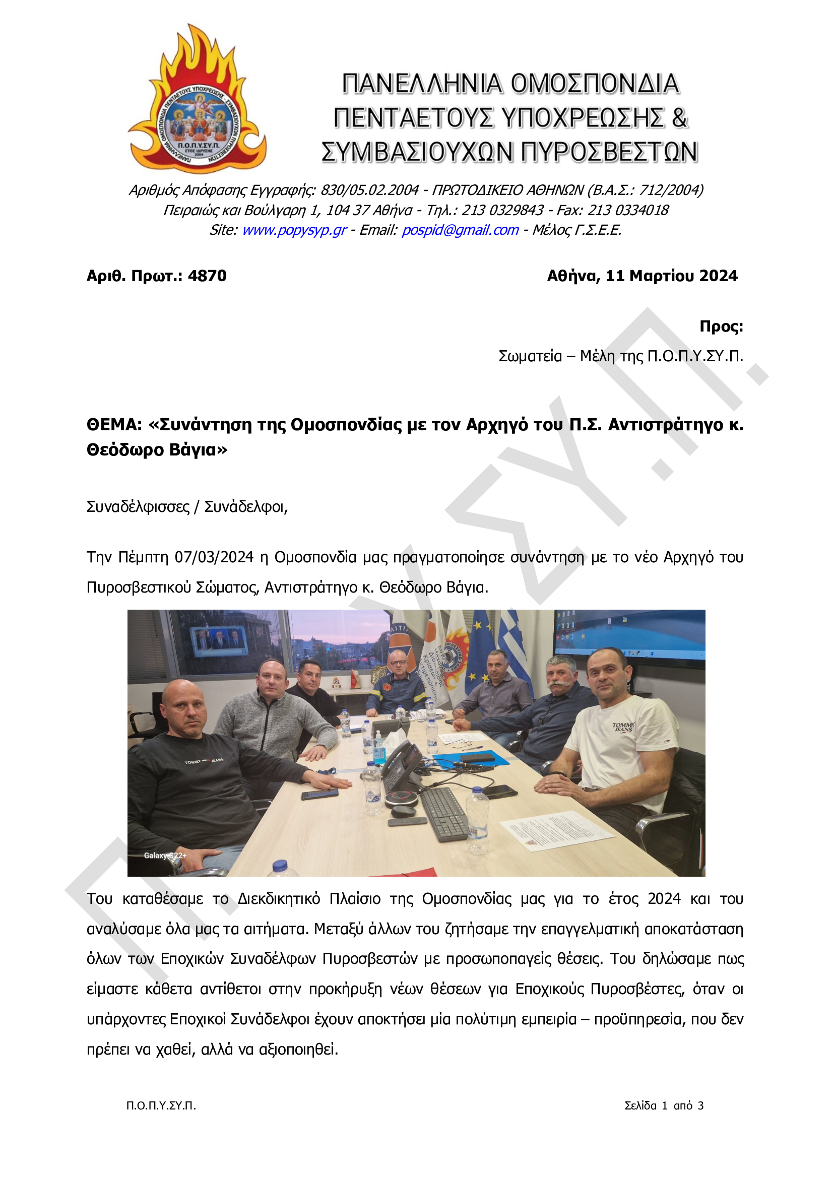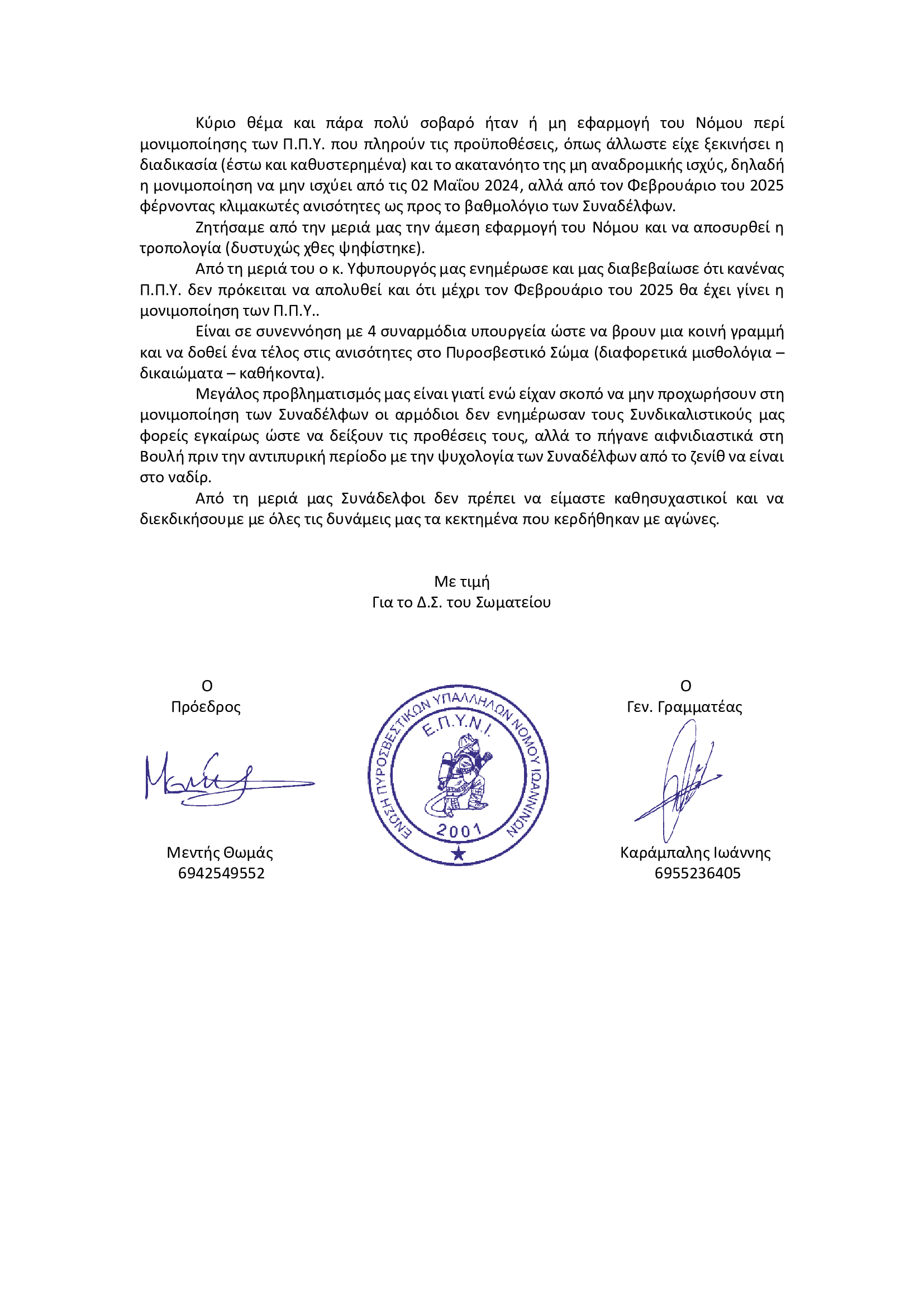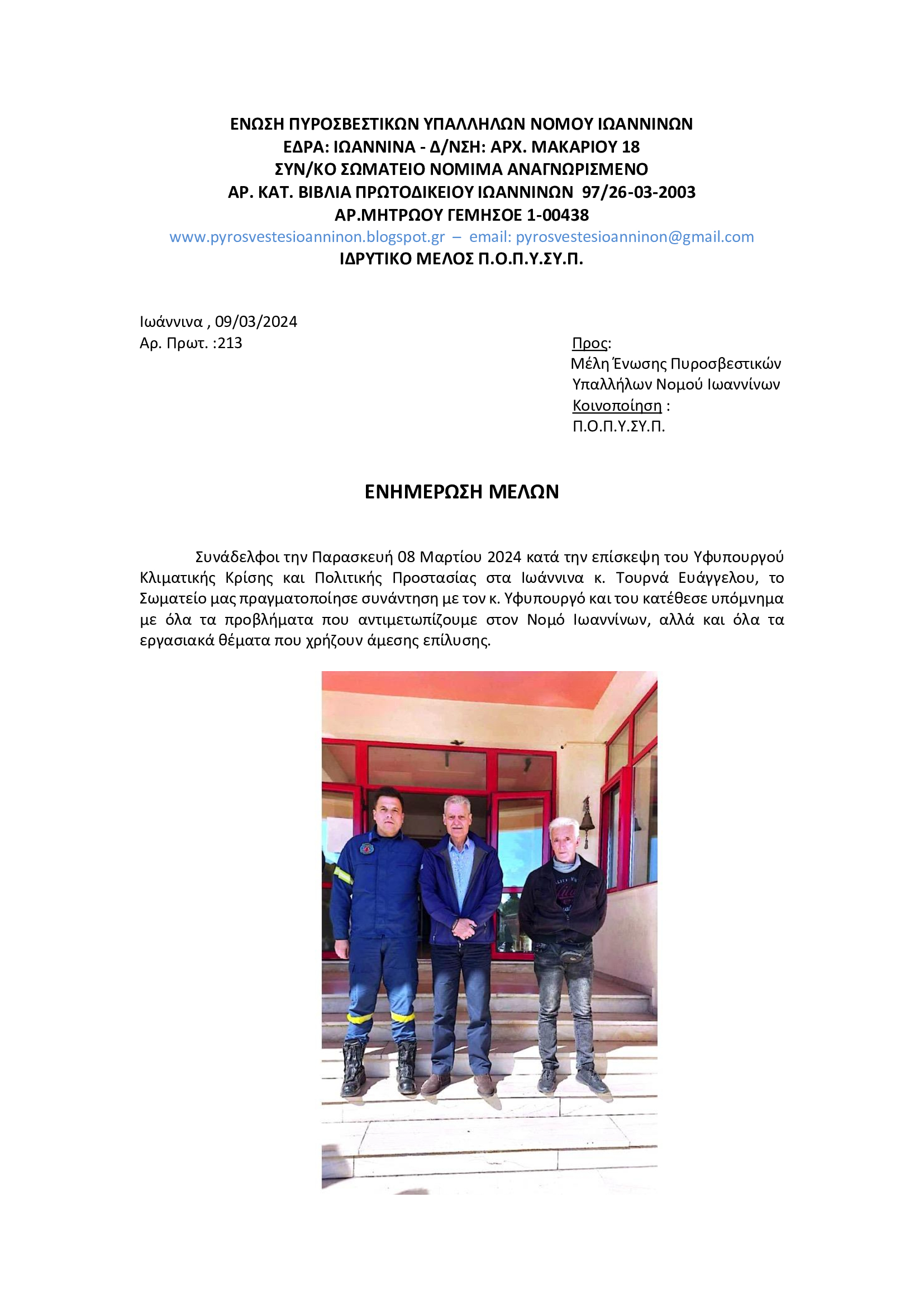 Συνάντηση της Ένωσης Πυροσβεστικών Υπαλλήλων Νομού Ιωαννίνων με τον Υφυπουργό Κλιματικής Κρίσης και Πολιτικής Προστασίας, κ. Ευάγγελο Τουρνά