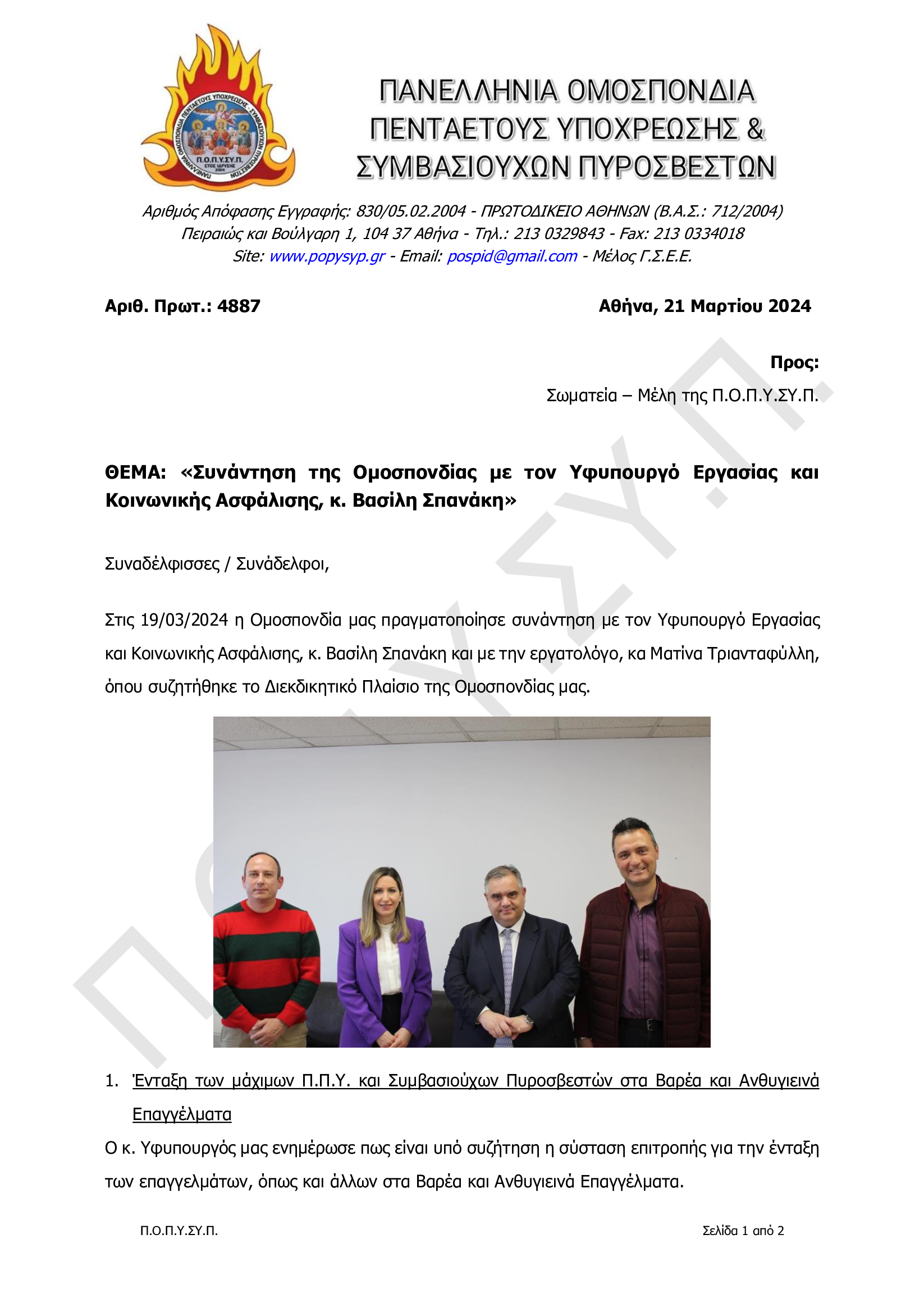 Συνάντηση της Ομοσπονδίας με τον Υφυπουργό Εργασίας και Κοινωνικής Ασφάλισης, κ. Βασίλη Σπανάκη
