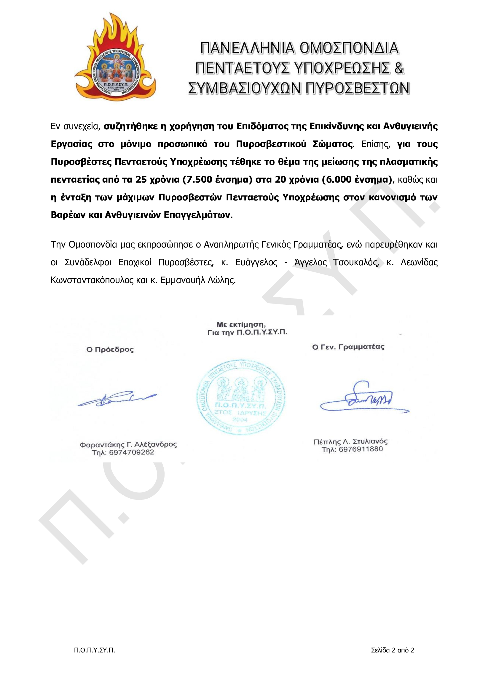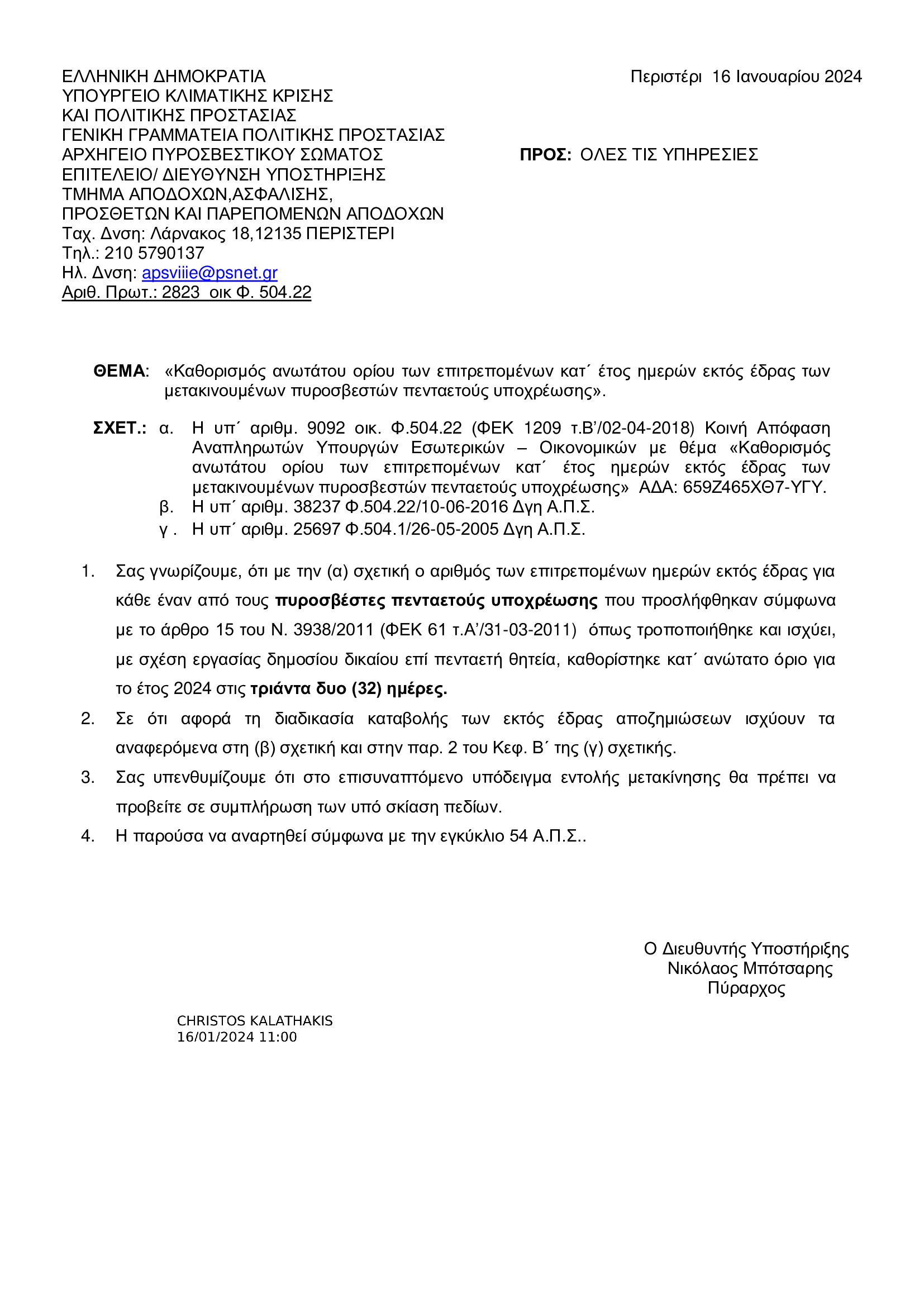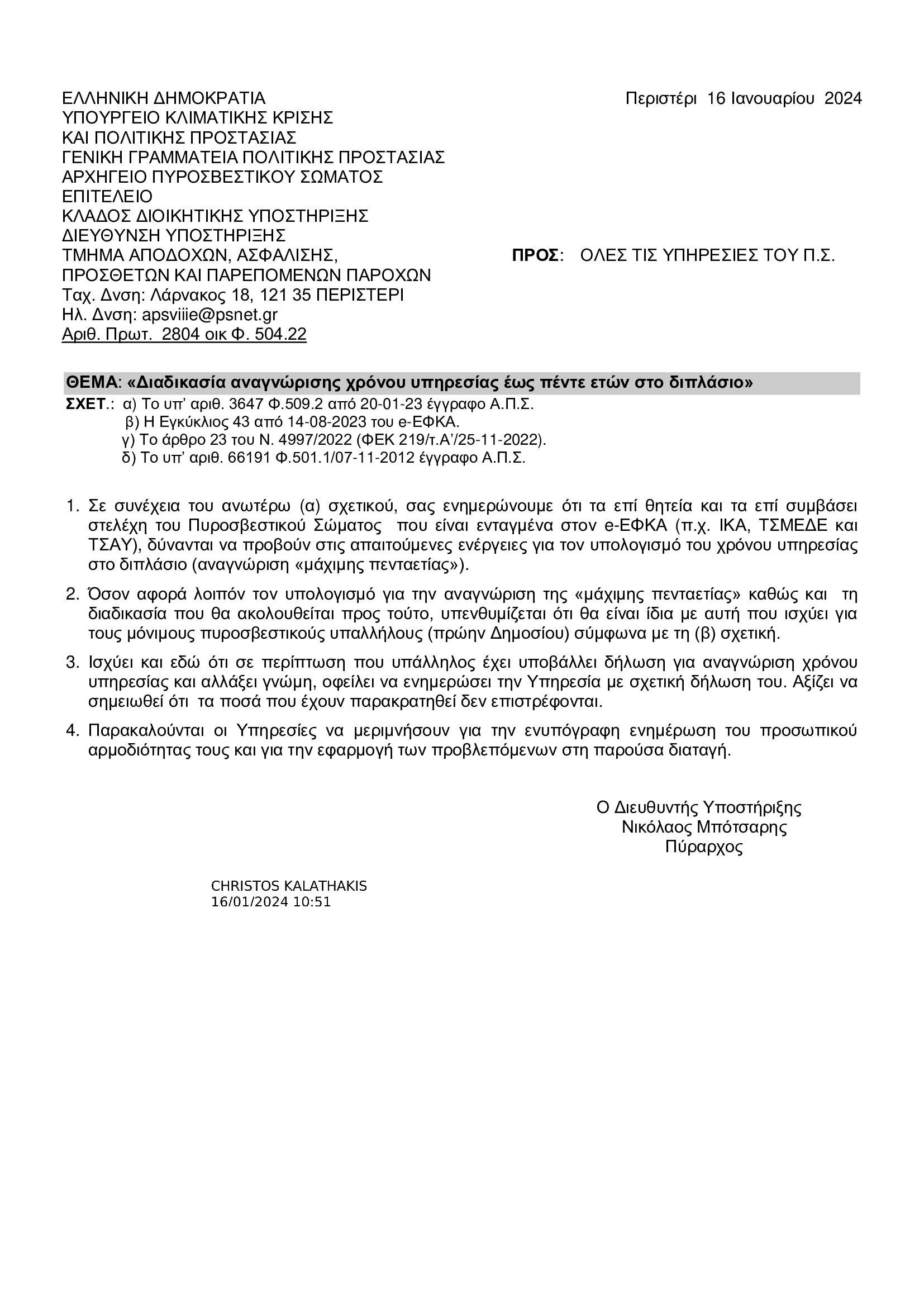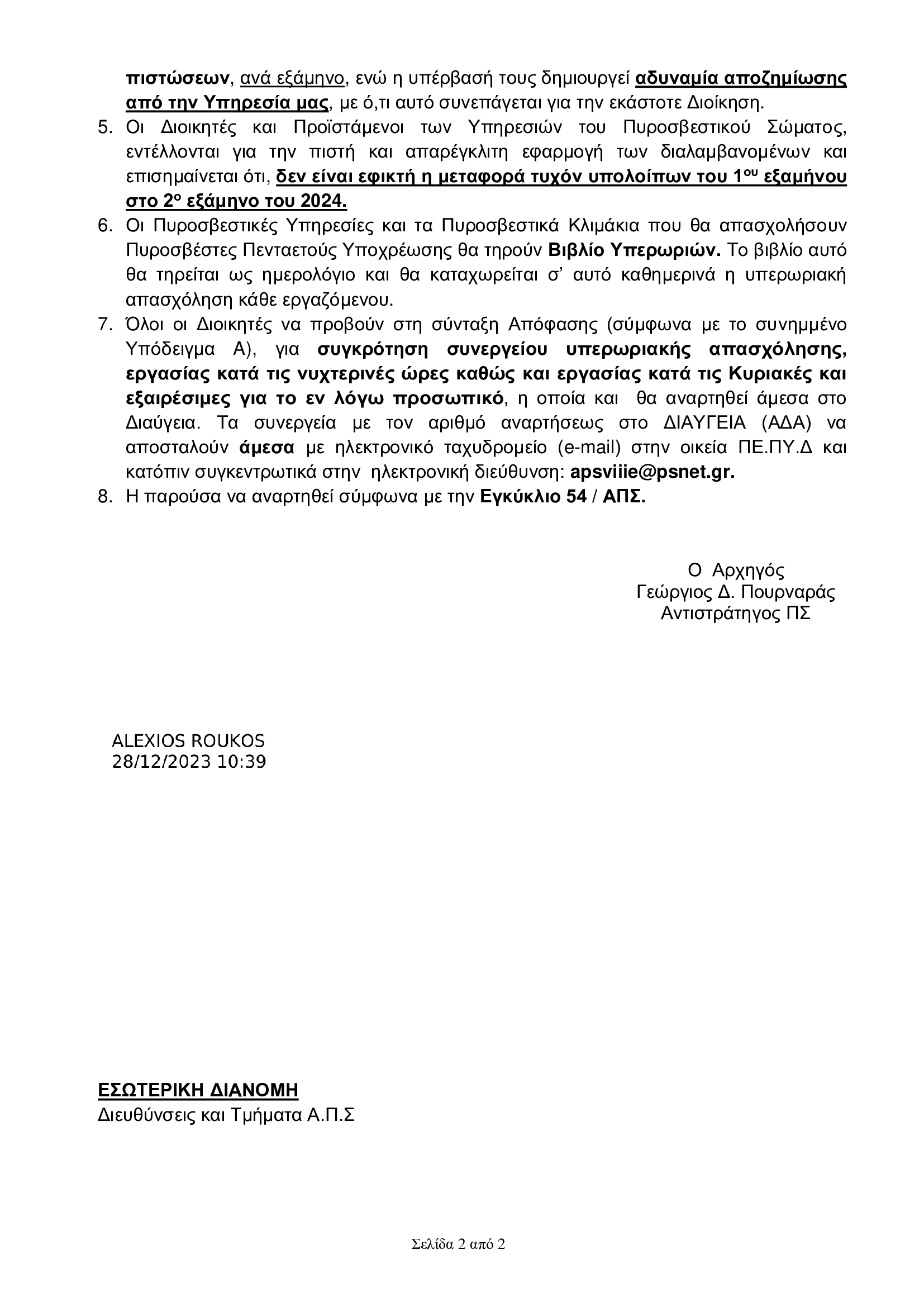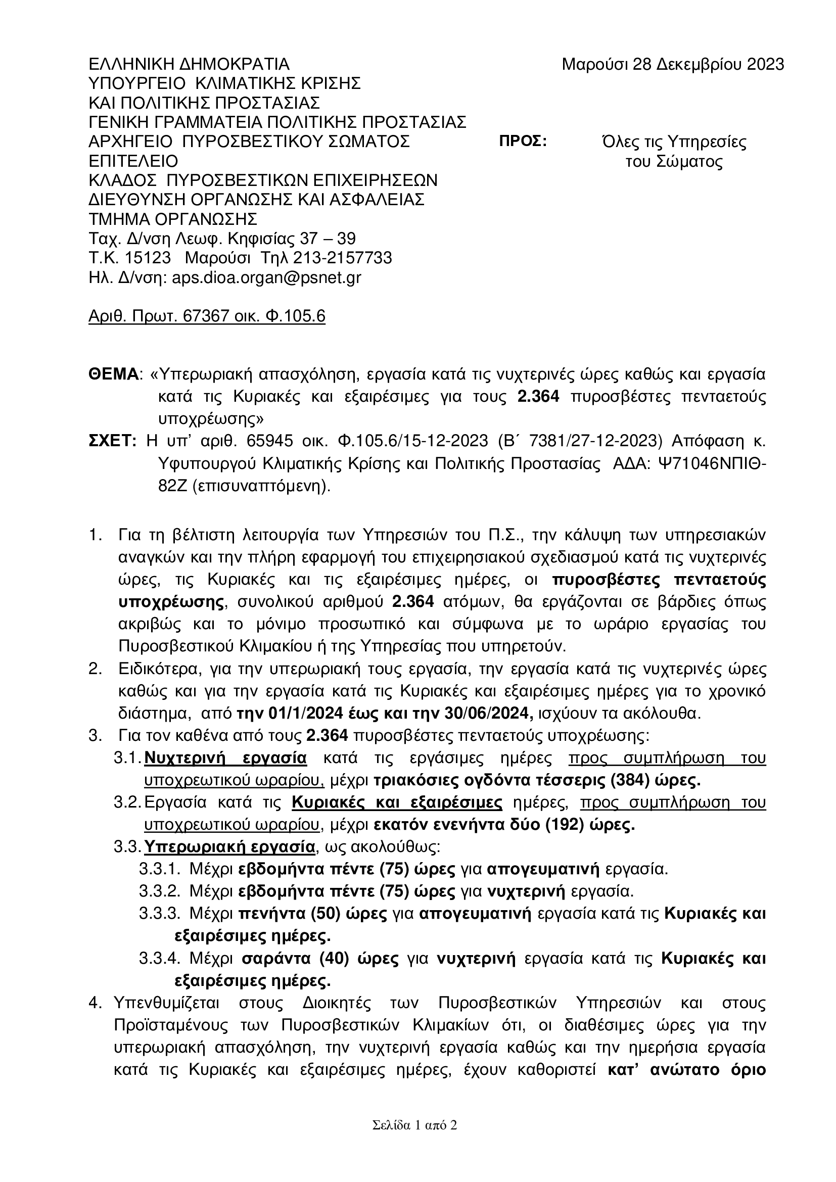 Υπερωριακή απασχόληση, εργασία κατά τις νυχτερινές ώρες καθώς και εργασία κατά τις Κυριακές και εξαιρέσιμες για τους 2.364 Πυροσβέστες Πενταετούς Υποχρέωσης