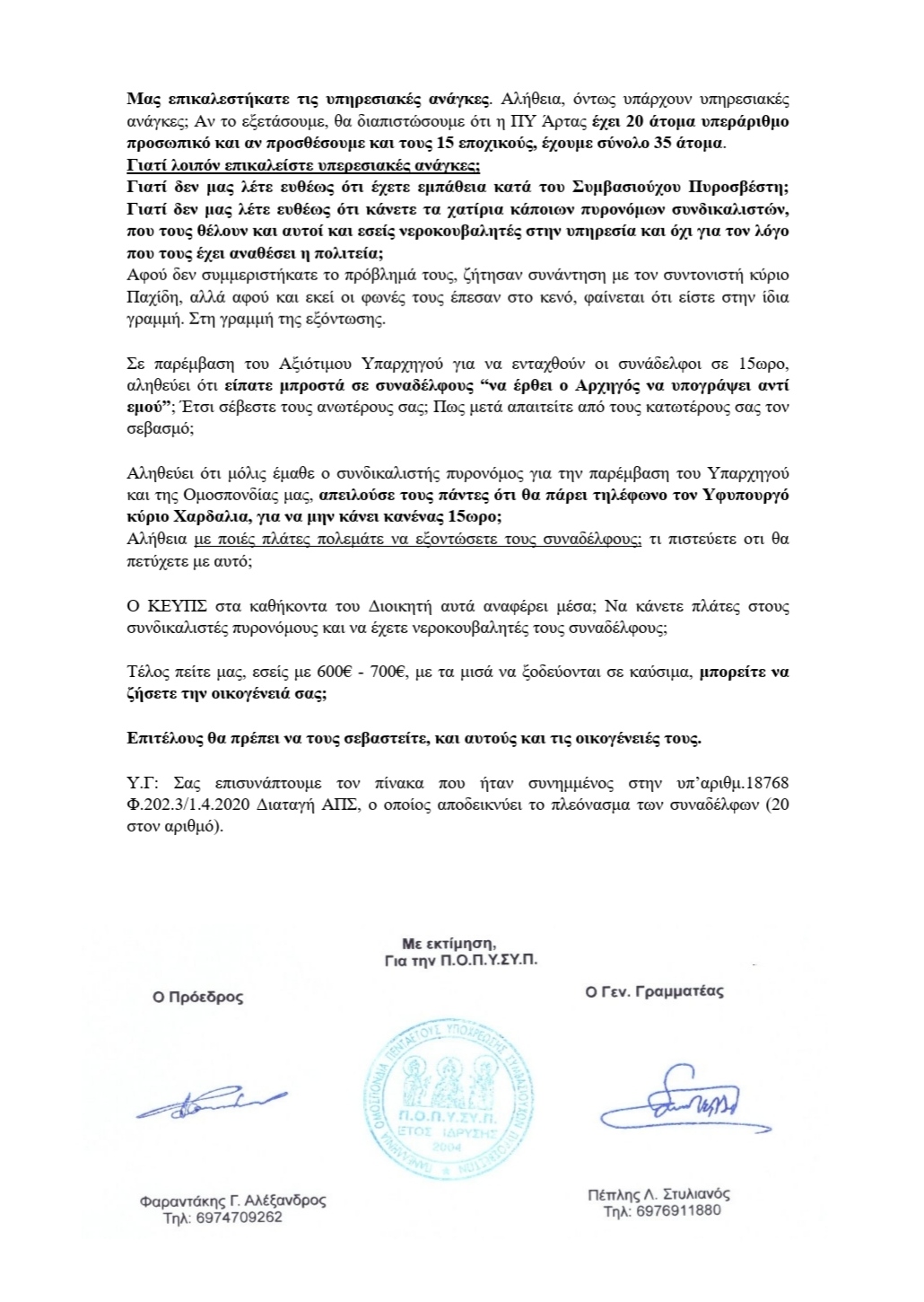 Βάση της μακρόχρονης συνδικαλιστικής αγωνιστικότητας της Ομοσπονδίας μας, επιβαλλόταν να διοργανώσουμε αυτή τη συγκέντρωση διαμαρτυρίας, αφού σε όλα τα δίκαια αιτήματά μας δεν έχουμε λάβει καμία απάντηση από την Πολιτική μας ηγεσία.