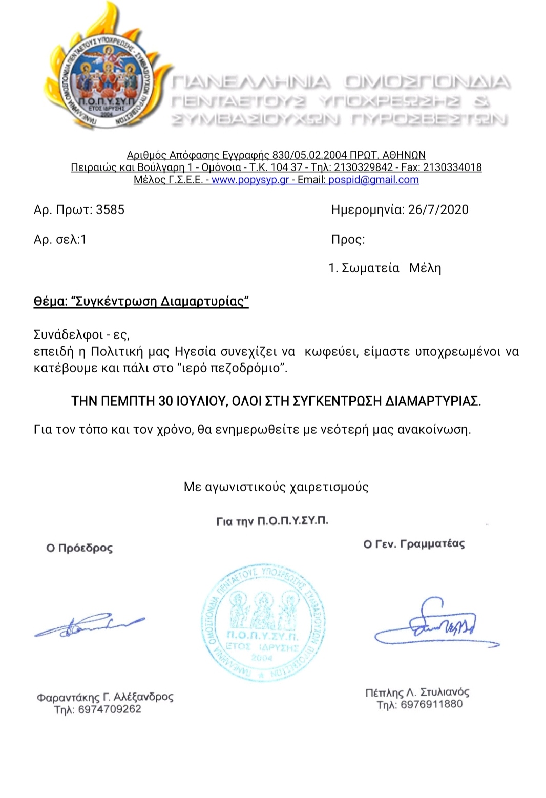 Ενημέρωση σχετικά με την Συγκέντρωση Διαμαρτυρίας στις 16/7/2020