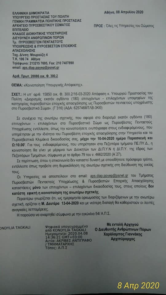 Διορισμός εκατόν ογδόντα (180) επιτυχόντων - επιλαχόντων υποψηφίων της κατηγορίας πυροσβεστών εποχικής απασχόλησης ως Πυροσβεστών Πενταετούς Υποχρέωσης στο Πυροσβεστικό Σώμα.