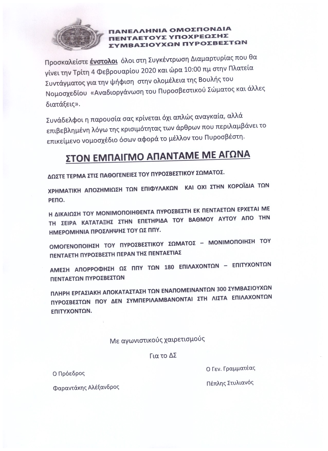 ΣΥΓΚΕΝΤΡΩΣΗ ΕΝΣΤΟΛΗΣ ΔΙΑΜΑΡΤΥΡΊΑΣ ΣΤΟ ΣΥΝΤΑΓΜΑ ΤΗΝ ΤΡΙΤΗ 4 ΦΕΒΡΟΥΑΡΊΟΥ ΣΤΙΣ 9:00 πμ ΕΝ ΟΨΗ ΤΟΥ ΝΟΜΟΣΧΕΔΙΟΥ "ΕΘΝΙΚΟΣ ΜΗΧΑΝΙΣΜΟΣ ΔΙΑΧΕΙΡΗΣΗΣ ΚΡΙΣΕΩΣ ΚΑΙ ΑΝΤΙΜΕΤΩΠΙΣΗΣ ΚΙΝΔΥΝΩΝ, ΑΝΑΔΙΑΡΘΡΩΣΗ ΤΗΣ ΓΓΠΠ, ΑΝΑΒΑΘΜΙΣΗ ΕΘΕΛΟΝΤΙΣΜΟΥ ΠΟΛΙΤΙΚΗΣ ΠΡΟΣΤΑΣΙΑΣ, ΑΝΑΔΙΟΡΓΑΝΩ